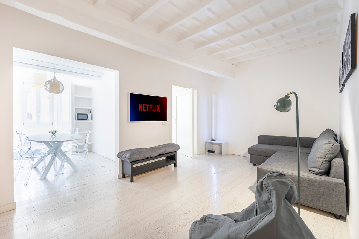 Nestled within a historic building facing one of the most iconic squares in the world, this one-bedroom apartment is located on the first floor and boasts modern amenities and an enviable patio, perfect for alfresco dinners. Ideal for couples or small families, the apartment features top-notch A/C system in all rooms, multi-room wireless sound system, steam bath as well as bathtub . Step outside the front door to toss your coin and immerse yourself in the lively atmosphere of the city center.