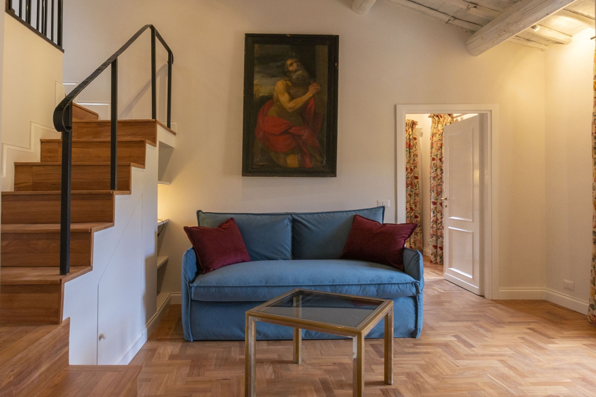 Appartamento al secondo piano di Palazzetto de Lante (senza ascensore con scale antiche in pietra strette e ripide, sconsigliate a persone con ridotta mobilità) con camera matrimoniale, area wellness con vasca romana e bagno turco. Bagno privato con doccia. Soggiorno con cucina completa, divano letto e piccolo bagno di servizio. La cucina è dotata di piastre a induzione, frigorifero, congelatore, forno tradizionale, forno a microonde e macchina Nespresso®.