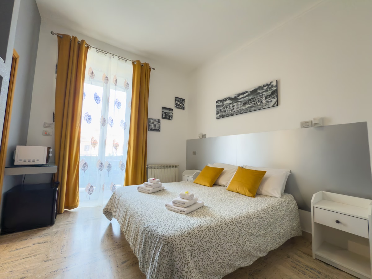 Spacious double room with a private EXTERNAL bathroom for exclusive use. BREAKFAST INCLUDED! Self check-in. 150 Mbps Wi-Fi. Air conditioning/heating. A TV is provided. Guests have access to a common room and a shared kitchenette. The building features an elevator. Its strategic location is just steps from Metro A and the Colosseum, perfect for exploring Rome's most famous monuments on foot. Easily and quickly reach any area of the city for an authentic Roman experience.