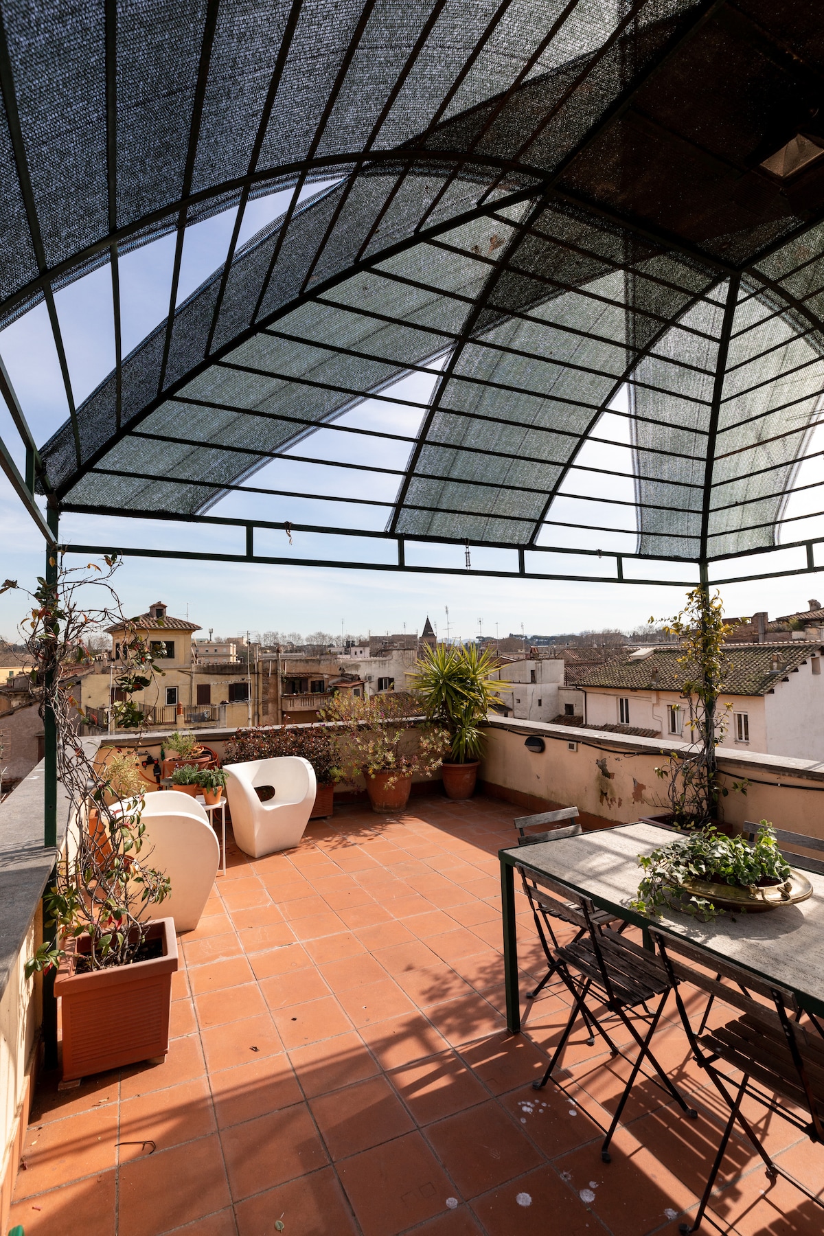 Bright and quiet penthouse apartment in the heart of Trastevere, with a wonderful terrace and an unparalleled view of charming roman roofs and the Gianicolo hill. The flat is meticulously refurbished and set in a picturesque cobblestoned street, just around the corner from the lively restaurants and cafes. La Casetta al Mattonato is located on the 3rd floor (41 steps, no elevator) of a 1600s typical roman building, within walking distance of all major attractions.