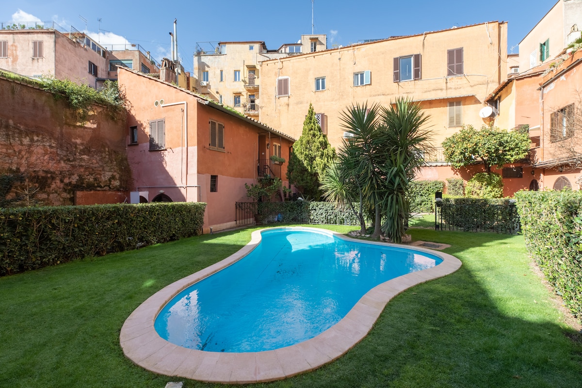 Appartamento signorile in palazzo storico del 1600 immerso in un giardino condominiale con piscina. Situato nel cuore di Trastevere , uno dei più caratteristici quartieri di Roma. E', in oltre, in una posizione privilegiata tale da rendere possibile raggiungere, in tempi brevi, tutti gli altri siti storici, artistici, ed archeologici della città: San Pietro, Colosseo, Pantheon, Fontana di Trevi, Campo de' fiori, Piazza di Spagna, Piazza Navona, Castel Sant' Angelo