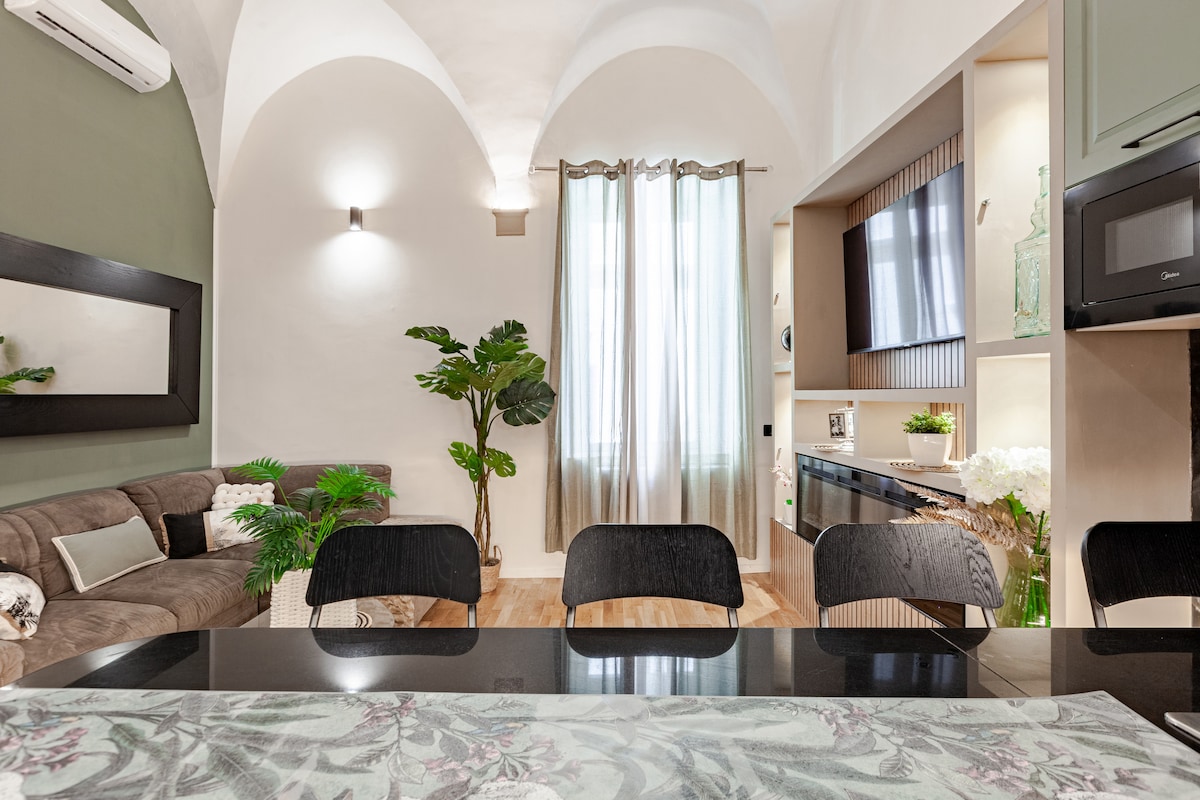 Enjoy a coffee at the marble breakfast bar, relax in the cozy window seat, or dine on the spacious terrace. This elegant apartment blends wood, marble, and traditional ceramics in a warm, refined style. Designed by renowned Roman interior designer Alessandra Danese, it holds the Plum Guide Luxury Apartment Certificate of Excellence. Guests enjoy full amenities including Wi-Fi, Nespresso machine, and a furnished terrace. Located in authentic Rione Monti, loved by locals.