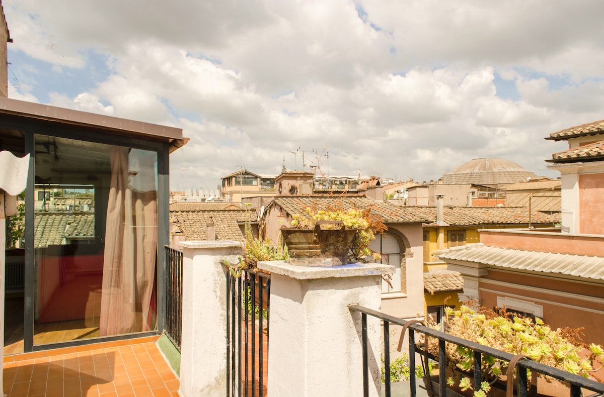 Bright and quiet penthouse apartment in the heart of Trastevere, with a wonderful terrace and an unparalleled view of charming roman roofs and the Gianicolo hill. The flat is meticulously refurbished and set in a picturesque cobblestoned street, just around the corner from the lively restaurants and cafes. La Casetta al Mattonato is located on the 3rd floor (41 steps, no elevator) of a 1600s typical roman building, within walking distance of all major attractions.