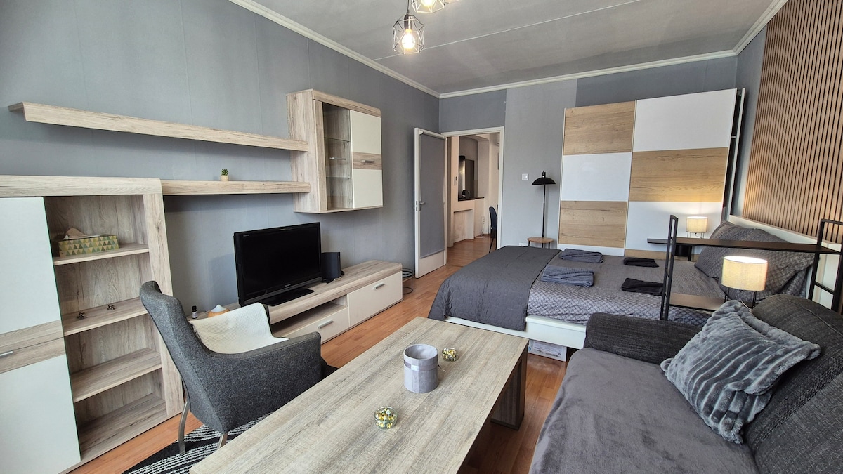 Cozy apartment with the best location possible, near the Károlyi castle. In the 9th floor with an excellent view. We provide: - an initial set of bedding and towels according to the number of guests -For reservations of 7 days or longer you are eligible to request a mid-stay cleaning for an extra charge -In the living room, the pull-out sofa serves as an extra bed. - For requests we can provide a travel bed for babies -The apartment is air-conditioned with a fully-furnished kitchen