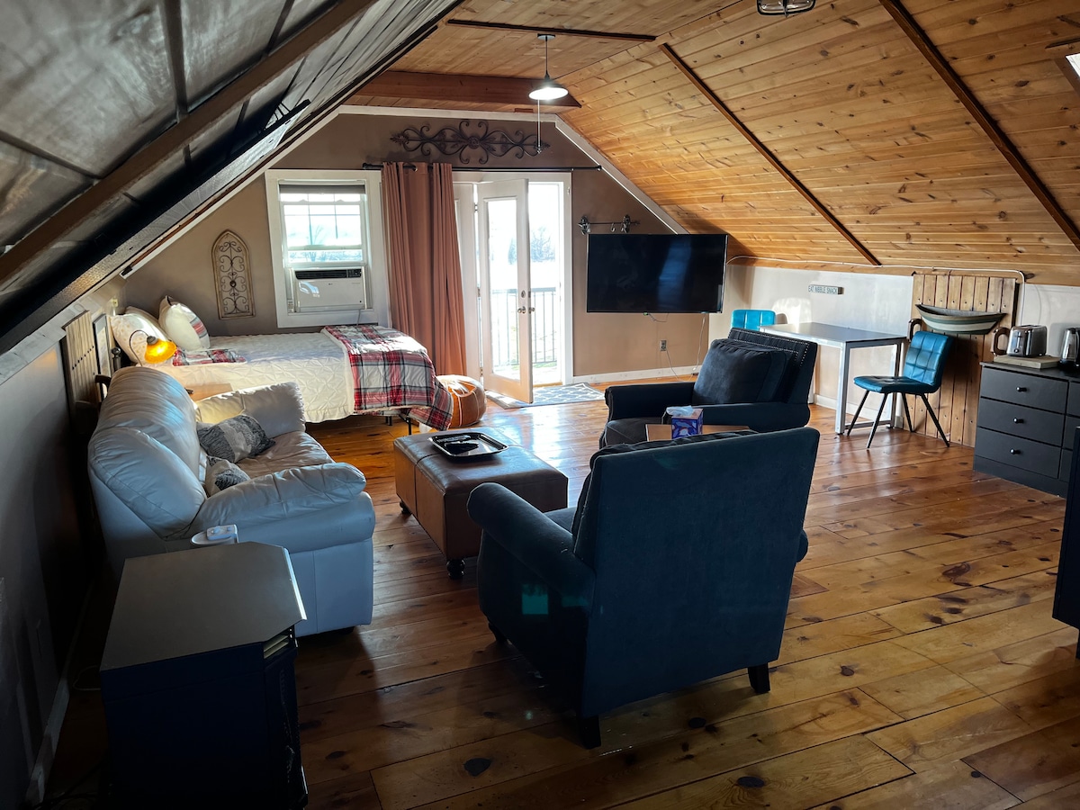 Welcome to Louisburg! Spacious, private entry, 1000 sq. ft. apartment above detached garage within minutes of wineries, antiques & Cider Mill. Set on 15 acres, and 2 miles down a gravel road, you are out of the city and seeing stars, with an amazing 2nd story view. Sleeps up to 6 with separate bedroom with queen bed and low ceiling (62” great for kids!) loft with 2 twins & a double. All wrapped in unique finishes including an amazing shower! Located only 45 minutes from downtown Kansas City!