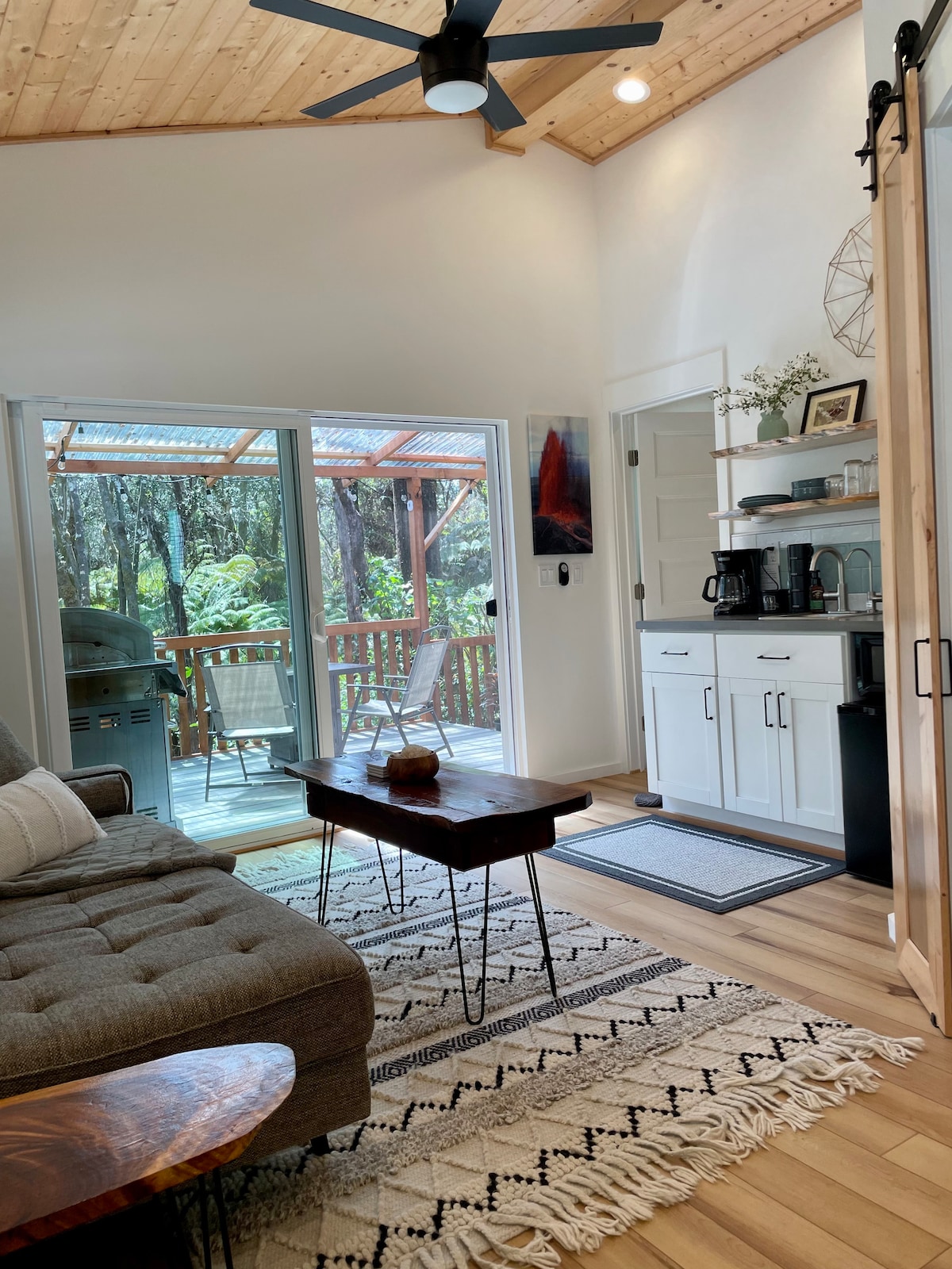 Welcome to The Flower Bed, a greenhouse cabin on the slopes of Mauna Loa, Big Island with everything you need for a great vacation. Relax on the outdoor patio, cozy up with a book on the loveseat, enjoy the rainfall shower. Gaze at the amazing stars and be lulled to sleep by evening nature sounds. Awake to birds in song and morning sun filtering through the window. Sample an edible flower, use a pinch of lavender for calm, and enjoy peekaboo ocean views. You won’t regret staying several nights!