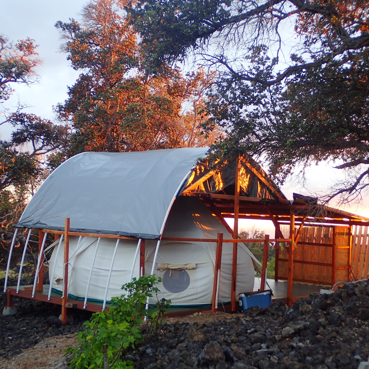 On the lava fields surrounded by Ohia trees you will find our cozy Lotus Dome. Embracing atmosphere with covered lanai, ocean view, a million stars at night, comfy Queen size bed and kitchen. At 50 feet outdoor bathhouse with shower, sink and toilet. Furnished Japanese style, a room with a view! Close to South point, Green & black Sand beach & snorkelfun bays. Kahuku volcano park is close, at 10 min, great hiking! Anyone is welcome, we are happy to receive you with a warm Aloha.