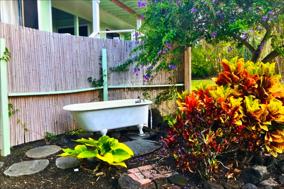Enjoy epic sunset views over the ocean while surrounded by lush jungle foliage. The scent of plumeria and the gentle calls of tropical birds will never let you forget you're in paradise. While you're here you'll be a stone's throw from many wonderful places to snorkel, as well as Place of Refuge National Park. This is a terrific base camp to explore Volcanoes National Park, Mauna Kea Observatories, the most southern point of the U.S., a black sand Beach and much more!
