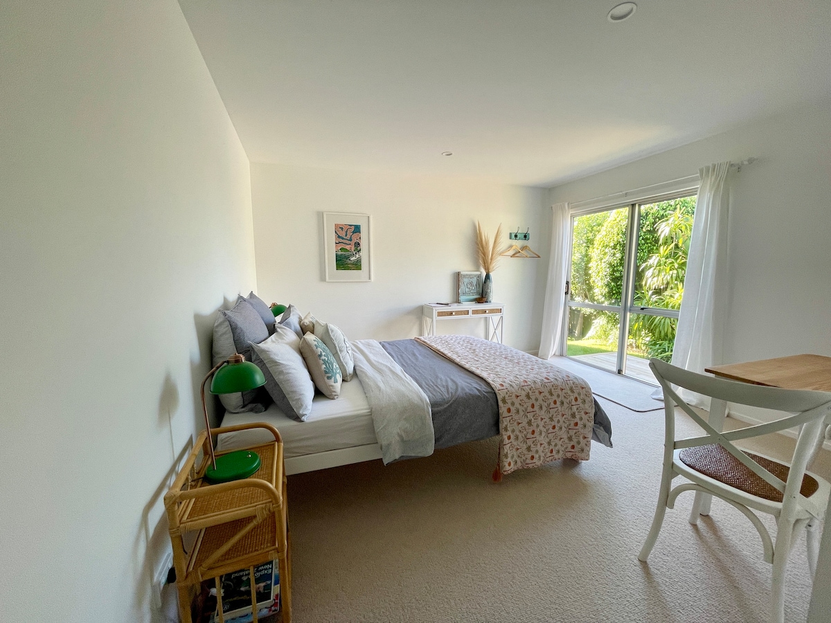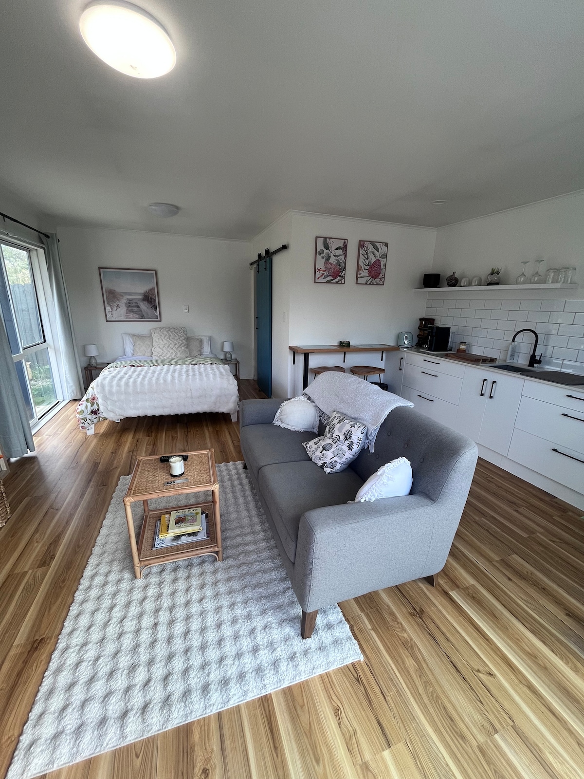 Stylish, light-filled studio in a quiet cul-de-sac, just minutes from Papamoa Beach 🏝️. Relax in a comfy queen bed with luxe linen, enjoy a modern bathroom, aircon, 42" smart TV, and a well-equipped kitchenette with cereal, coffee & treats. A futon sofa converts to a double bed for extra guests. Work with fast Wi-Fi, unwind on your private grassy lawn, or stroll to the sand. Safe off-street parking makes arrival easy. You’ll find everything you need to relax, recharge, and feel at home.