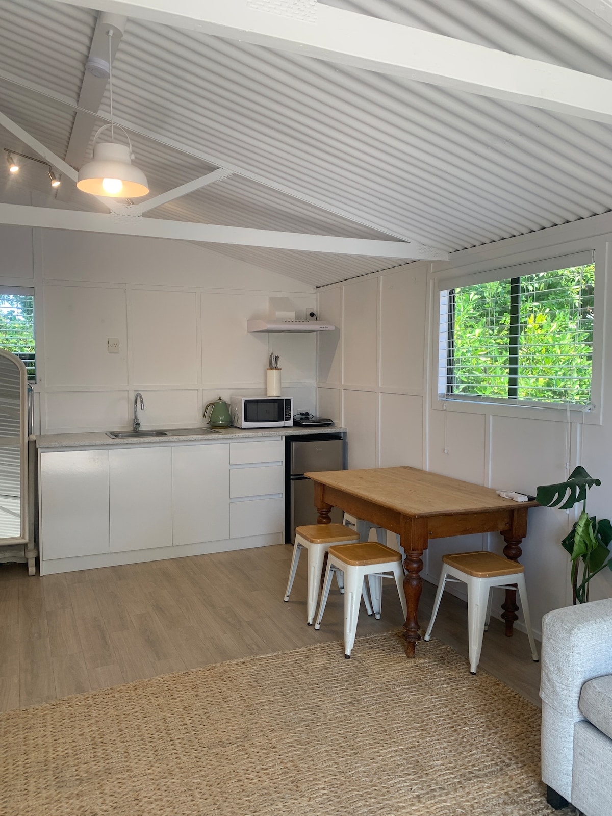 This very cute and comfortable self contained unit has a king size bed, with ensuite (shower and toilet). Includes basic kitchenette that has a microwave, air fryer, electric frypan, fridge, plus tea & coffee facilities. There is no kitchen sink, so not ideal for lots of cooking, but perfect for basic heat ups etc. Two minutes walk to beach, shops, cafés and restaurants. Off street parking, with bus stop outside.
