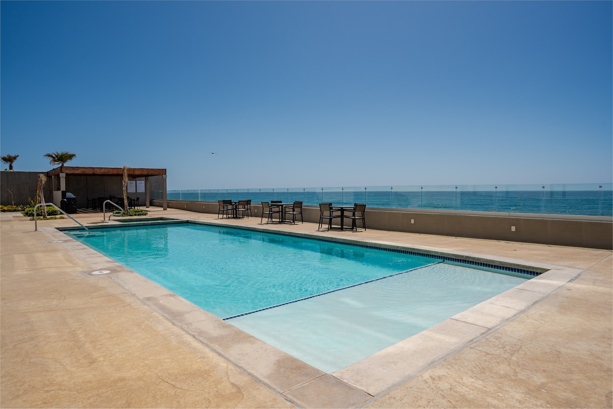 Luxurious Oceanfront Condo 2 bed, 2 bath at Riviera de Rosarito. Corner unit. Rosarito at the beach. 180 degree Ocean views. Top tier internet speed. Walking distance to restaurants, Papas & Beers, shops and more. Right on the beach. Lg master, king bed. Bathrooms have doors! Dual Sink Vanity. 2nd bedroom has queen bed and futon & nearby bathroom & shower. Wake to the sound of waves. Guard gated secure complex with parking, pool, hot tubs, fire pit, bbq area, exercise room and clubhouse.