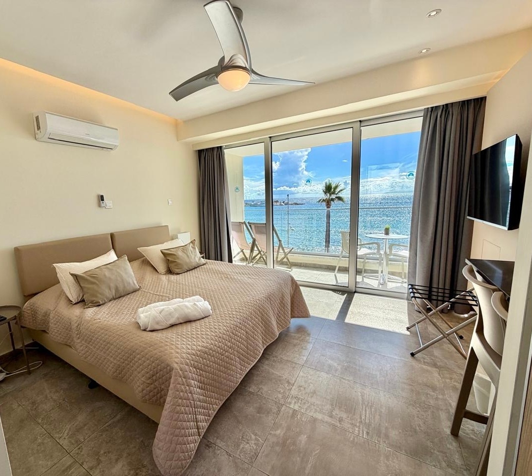 This panoramic sea view studio apartment is overlooking the Harbor and Medieval Castle of Paphos. It is located in the heart of tourist and historical area of Kato Paphos, a minute walk to the sea, promenade, bars, restaurants etc. The studio apartment is compact (21 sqm), with private bathroom, fully equipped kitchenette, balcony, A/C, free WIFI and smart TV. Breakfast is included at our Harbour restaurant located just around the corner starting from 9:30 am - 11:30 am.