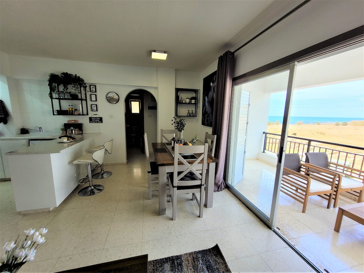 Reg. Number: AEMAK-PAF 0002076 Smart TV. !The construction of the seafront pedestrian way is done . Modern renovated 1 bedroom apart ( 47m2 ) with a living room + large uncovered terrace (14 m2)with panoramic sea view , 50 m from the sea. Apartment is well equipped with appliances . Located 1 minute walk from the small beach before the complex and 8 min walk from the spacious sandy Coral Bay beach with all facilities . WiFi and Netflix are available. Electricity is extra charge by meter.