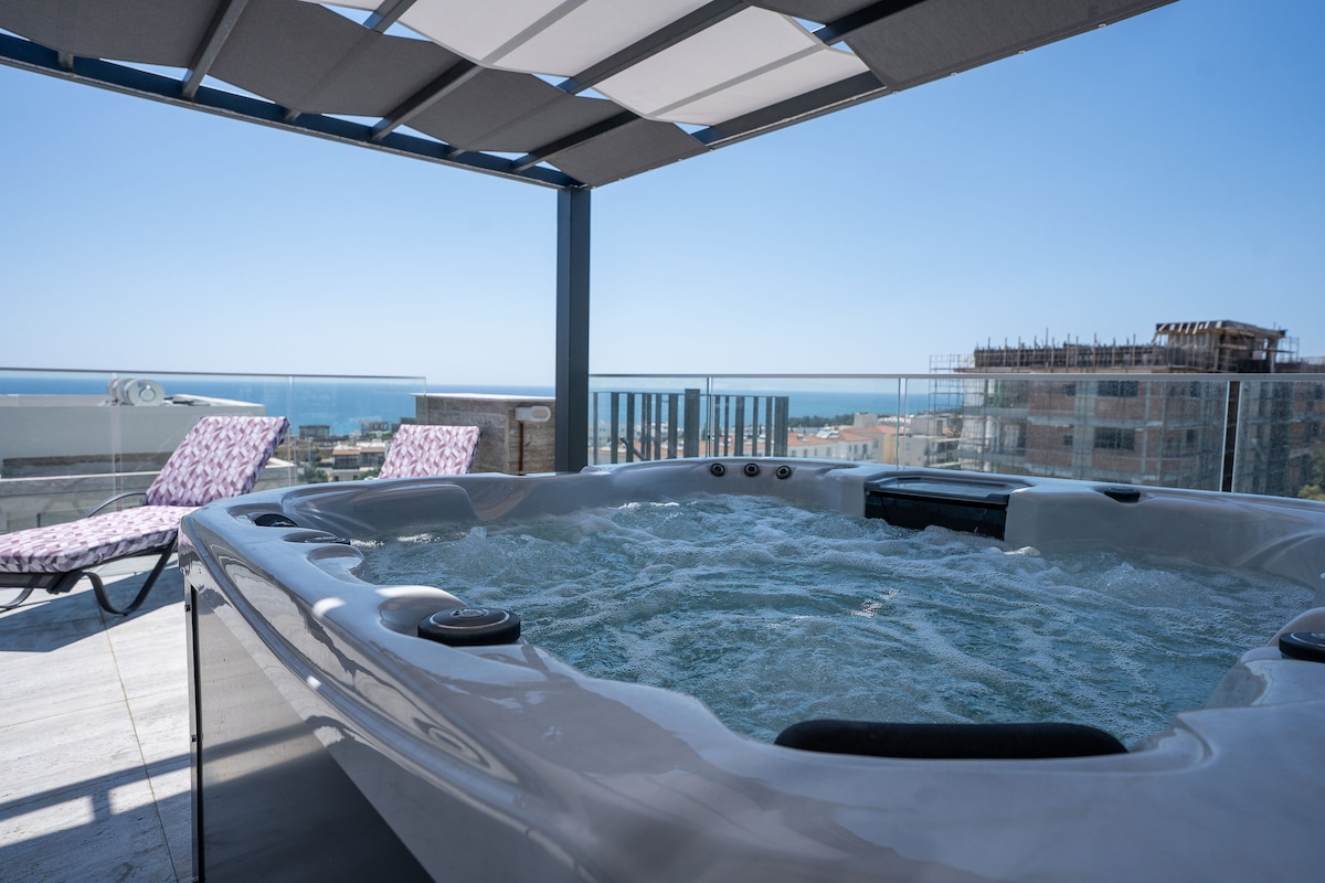 Modern 2-bedroom apartment in the heart of Paphos with stunning PRIVATE roof terrace including our private hot tub, and large BBQ to make those amazing holiday memories. Enjoy sea and city views, open-plan living, two bedroom, two bathrooms, and a dedicated workspace. Close to Paphos Harbour, and a stones throw away from Venus beach with its stunning broad walk, Paphos Archaeological Park and top restaurants. Ideal for families, couples or remote workers seeking comfort, style and convenience