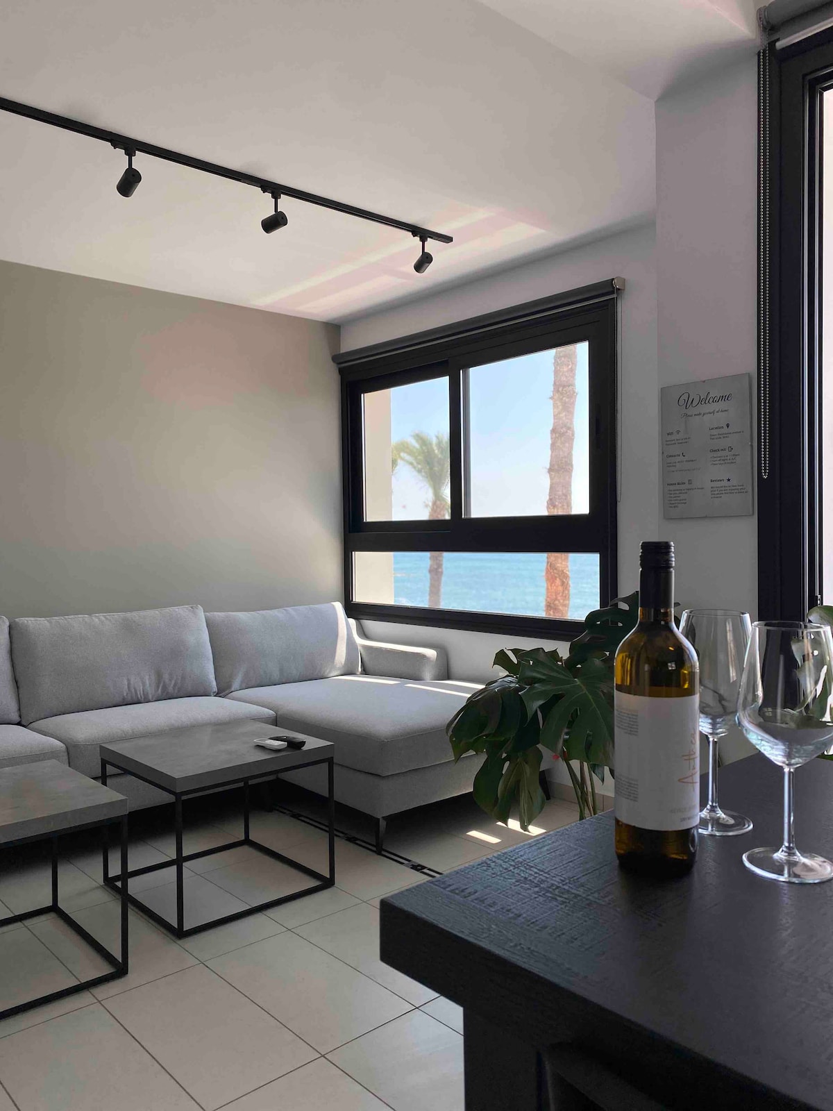 Relax in this cozy ground floor studio apartment with stunning views of the sunset and the sea! …. all within walking distance to bars, supermarkets, the mall restaurants and venues. Choose to have breakfast sitting by the natural shade of a lemon tree and listening to the mesmerizing sound of the waves! This classy studio apartment boasts open-plan living, an ideal base to explore Paphos. Wonderful for a couple or a couple with 1 or 2 children!