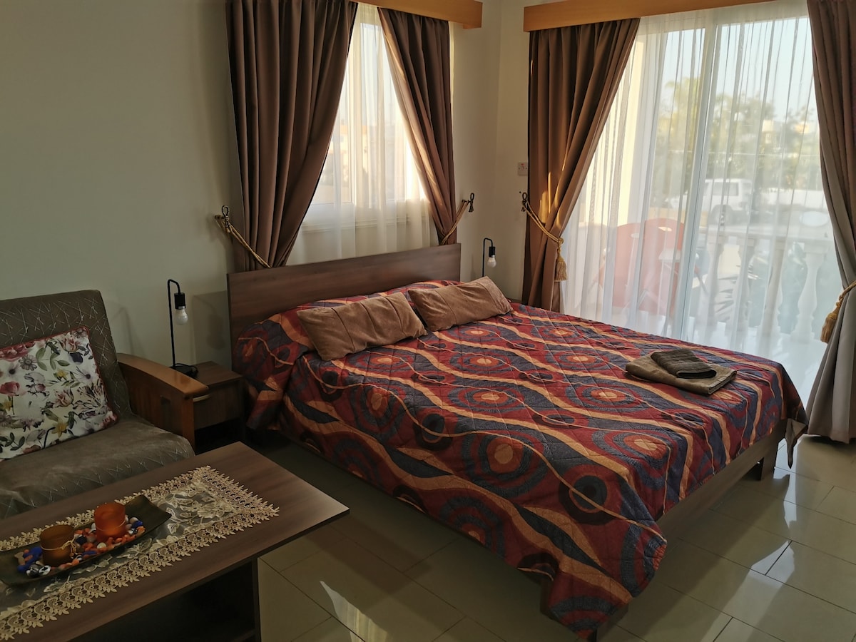Studio with patio. for 2 persons. size of the room 27 square meters included furnitures & 7 square meters patio. Double bed. Full renovated. Hairdryer _ wifi free internet access _ T.v (flat screen .43 inches). big fridge _ washing machine. ceramic electric cooker coffee machine ....... very strong Aircontition or heater _ ceiling fan _ spoons, knifes,plates are also available