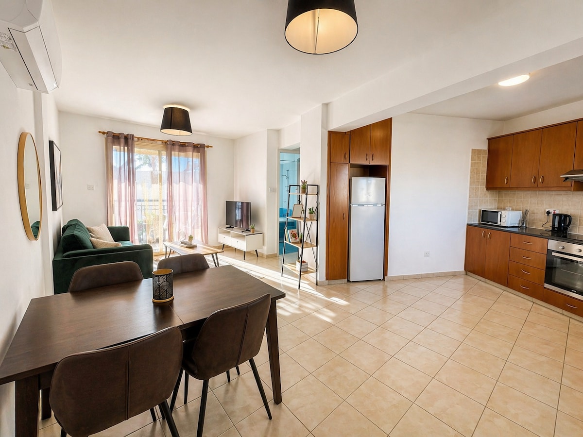 Reg. Number: AEMAK-PAF 0002076 Smart TV. !The construction of the seafront pedestrian way is done . Modern renovated 1 bedroom apart ( 47m2 ) with a living room + large uncovered terrace (14 m2)with panoramic sea view , 50 m from the sea. Apartment is well equipped with appliances . Located 1 minute walk from the small beach before the complex and 8 min walk from the spacious sandy Coral Bay beach with all facilities . WiFi and Netflix are available. Electricity is extra charge by meter.