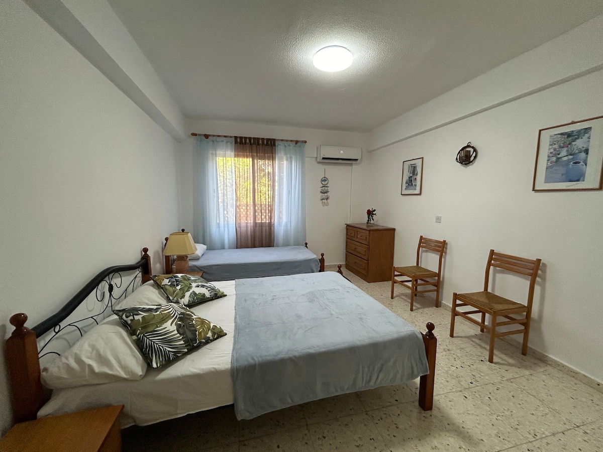 Renovated, spacious apartment just a few minutes’ walk from the sea, located in the heart of Paphos, near lively Bar Street. The apartment is my personal home when I return to the island, fully equipped for a comfortable stay. Two separate bedrooms with new air conditioners, a bright living room with a sofa bed and AC, and a fully equipped kitchen. Electricity is charged separately according to actual meter consumption, which is standard practice in Cyprus.