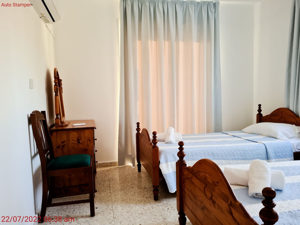 With this magnificent and cozy home, you will enjoy a relaxing vacation. it has a lovely two bedrooms with 2 single beds / sofa bed, king size bed, 1 sofa bed at the setting room, fully equipped kitchen, a patio with a garden/pool view. All rooms has A/Cs, a pool/ garden view balcony. You are almost at the center of every thing: Kings avenue mall (5 mins), Paphos waterpark (7 mins), Alykes beach (8 mins).