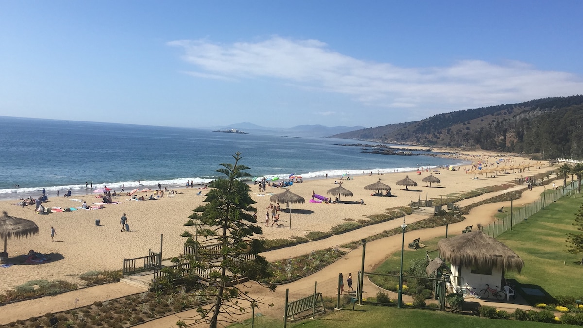 Departamento nuevo, acogedor y moderno en primera línea al mar. Con todo el equipamiento para simplemente disfrutar y hacer lo que quieras en Papudo. El departamento está a metros de la playa, puedes trotar por la costanera hacia el bosque bordeando el mar, surfear, andar a caballo, jugar golf, hacer stand up paddle, etc.