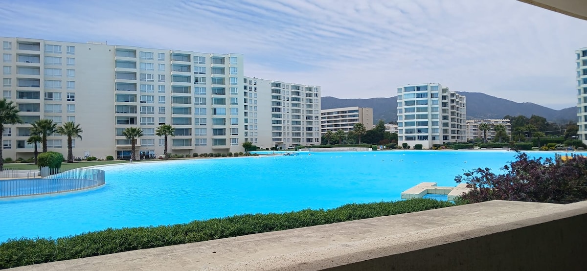 Espectacular y acogedor depto. 2D/2B en el exclusivo Condominio Papudo Laguna, 3er piso, con vista despejada y privilegiada a la laguna artificial del condominio y al mar. El Edificio cuenta con 3 piscinas, playas artificiales en cada una, deportes acuáticos en laguna, canchas de tenis y futbolito, juegos infantiles y seguridad las 24 horas. Puedes ir caminando a la playa desde el condominio. Contamos con TV HD iptv, Wifi por fibra óptica Movistar y estacionamiento privado y seguro.