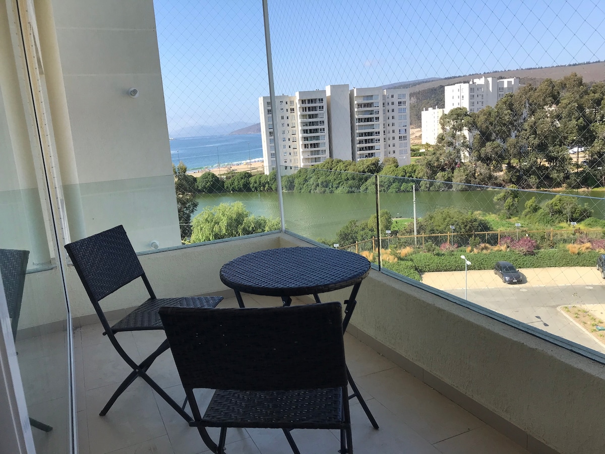 Hermoso departamento recién entregado en Papudo, fantástica vista a playa y laguna donde se realizan deportes náuticos, equipado 100%, linda decoración, cocina equipada completa, todo para 6 personas, televisores y parrilla a gas. Todo el equipamiento es nuevo. Ambos baños con ventana y secador de pelo. El condominio cuenta ademas con multicanchas, lavandería, sala de eventos, canchas de tenis y laguna navegable con uso de Kayak gratis para los usuarios. Tenemos 70 canales de Tv y wifi.
