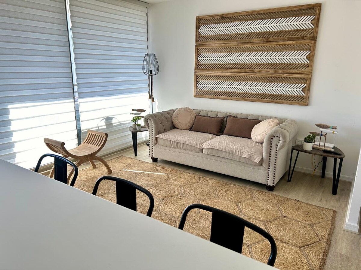 New and central condo apartment 1 block from the beach and plaza, where the best bars, restaurants, cafes and stores in Papudo are located. Ideal for families, couples and friends who want to stay in a comfortable, safe place, with 2 swimming pools, barbecue areas, a relaxation room with various amenities. All spaces have access for people with reduced mobility. Located in a strategic and privileged location steps from the beach, yacht club and fishermen's cove.
