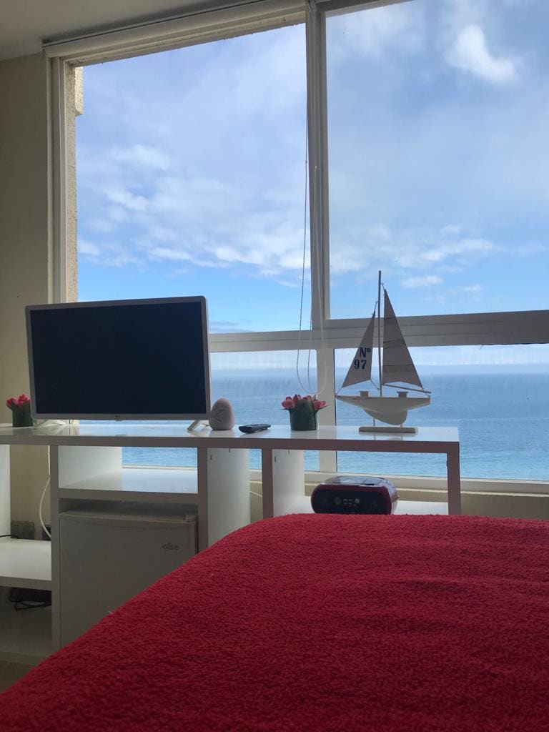 Depto full equipado con vista panorámica al océano pacifico en condominio con conserje 24hrs, frente a playa Chungungo, Tiene 3D y 2B, 7 camas en total. Cocina completamente equipada y parrilla eléctrica en terraza, cuenta 2tv en living y dormitorio principal, wifi, netflix, tvcable, parlante, colección de películas, calefacción central y bosca, lavavajillas, lavadora y secadora de ropa, sabanas y toallas. 2 estacionamientos y bodega con implementos de playa(sillas, quitasol, baldes,etc).