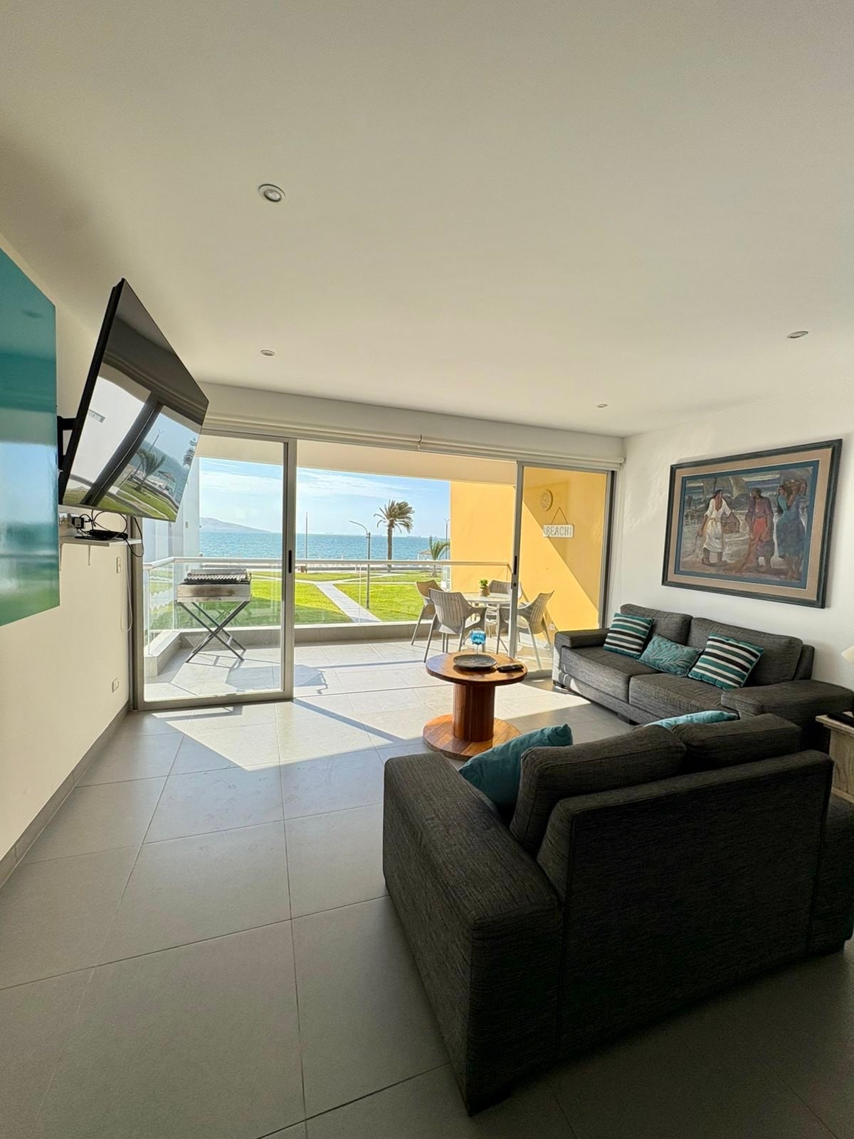 Minidepartamento con terraza frente al mar, primera fila (exactamente en la carretera de Pisco/Paracas) Cochera dentro de la propiedad incluida. -10 minutos de Paracas. -5 minutos al centro de Pisco. Cuenta con 2 habitaciones (cada una con cama matrimonial) Cuenta con cocina,menaje hervidor eléctrico, microondas, frigobar, parrilla y utensilios.