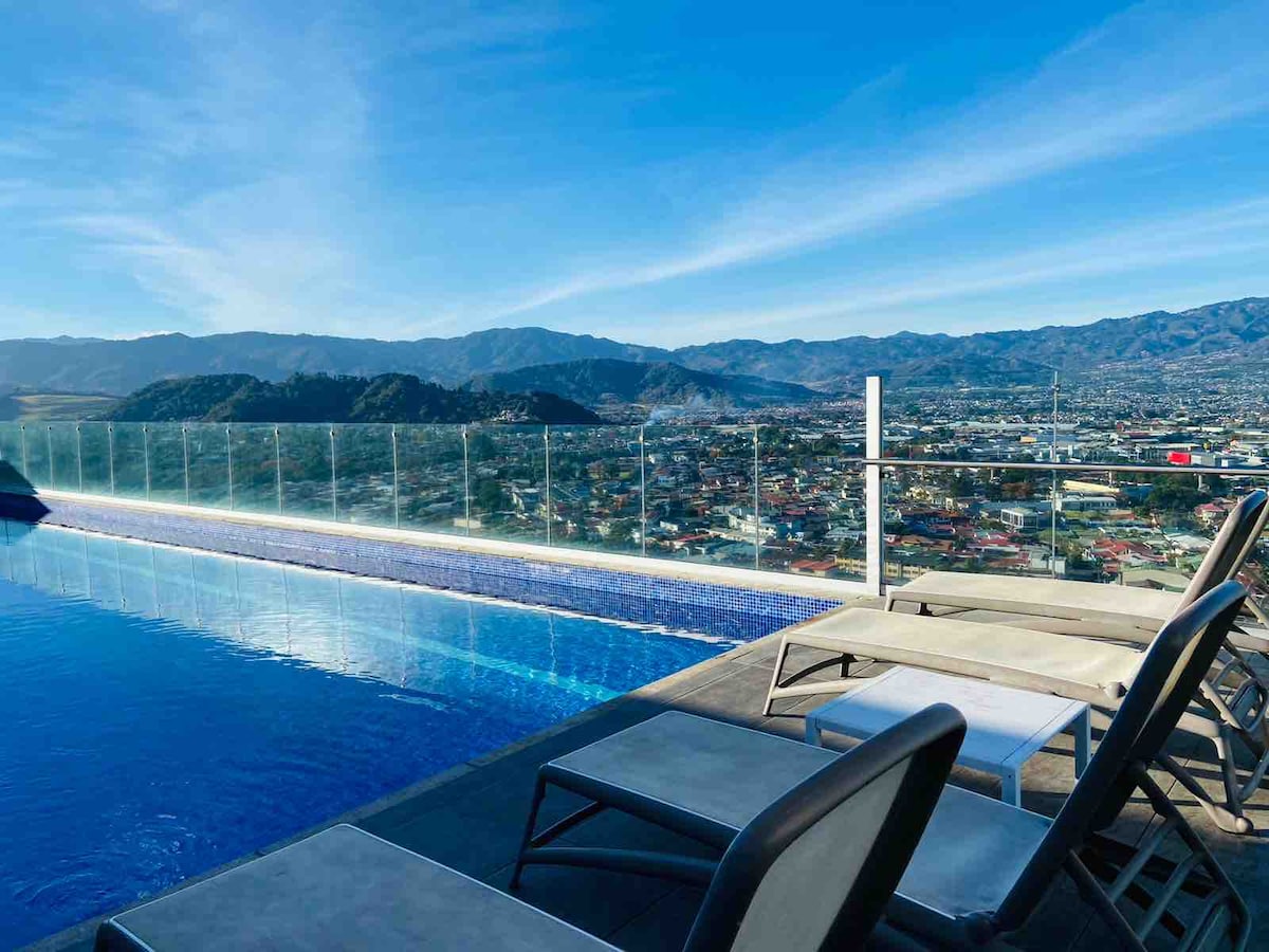Lets chat for a FREE early check in 24/7 security, ONLY building to park a PICK-UP Get up in the morning to the most magnificent view of Irazú Volcano, enjoying a cup of the most amazing costarican gourmet coffee. Get on to the amenities to enjoy a relaxing session in the Sauna or Hot Tub, put in a day of work then go out for a 2 minute walk to a delicious restaurant finally back home a comfy queen bed will welcome you. Tons of public transport available including a small train station.