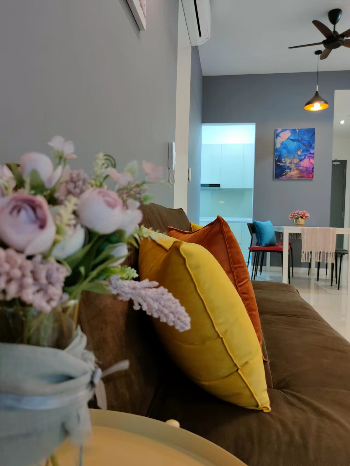 Have fun with the whole family at this stylish place. Suitable for small family who needs the convenience of direct access to the mall. Comes with a queen bed, single bed and a sofa bed. Light cooking is allowed. Filtered water available. Washing Machine available Enjoy your stay at our warm little place.