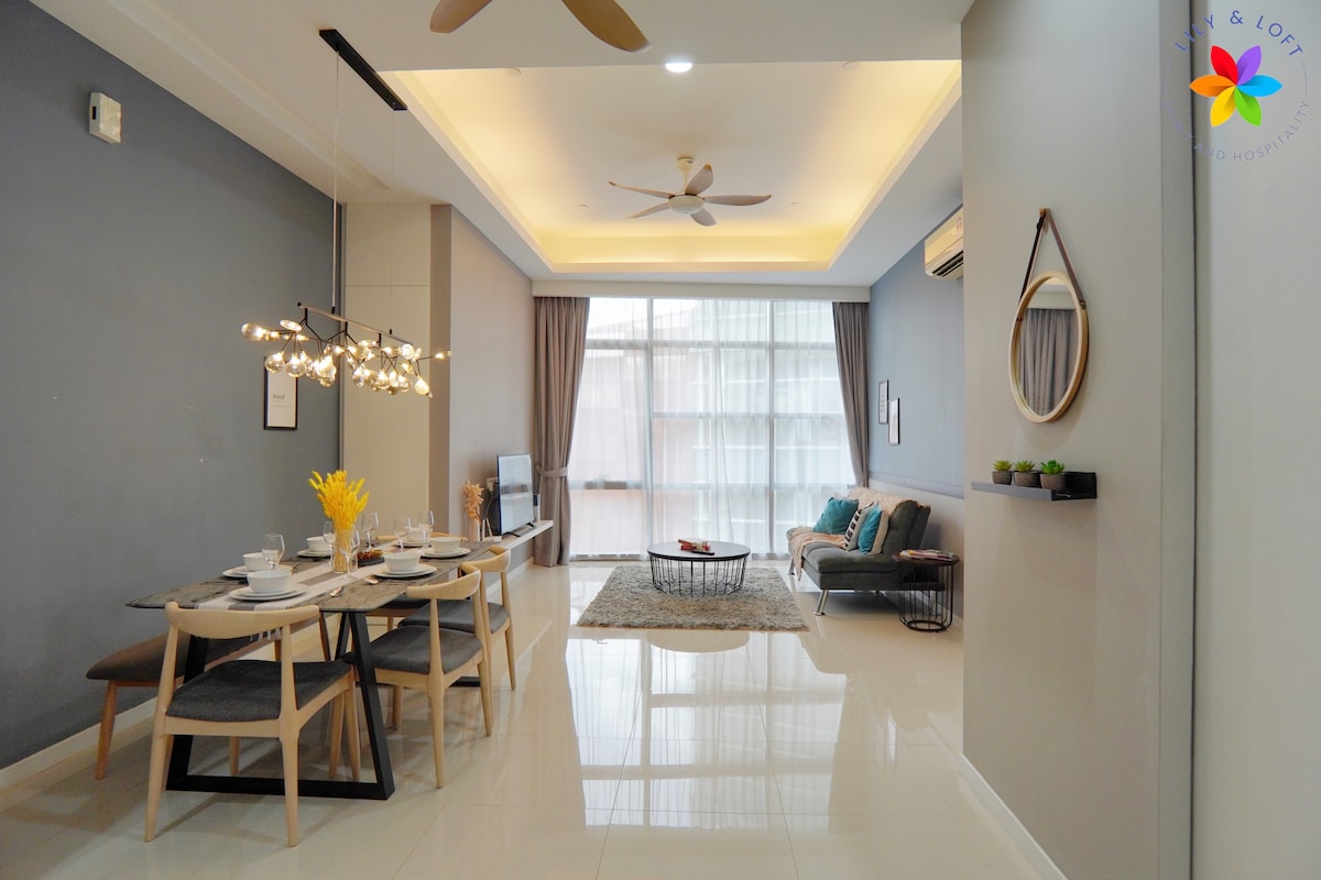 2 bedrooms, 2 bathrooms luxury service apartment. unlimited 800mbps (Unifi)high speed internet.43 inch smart tv in the ensuite bedroom.55 inch smart tv in the living room. Kitchen facilities with built in gas hob, refrigerator, microwave.Door steps to cinema , F&B outlets , Lotus at paradigm mall. Easy access ,Located in the same building with Le Meridien Hotel roof top bar, best view in town).24 hours 3 tier security with access card to enter building with private carpark