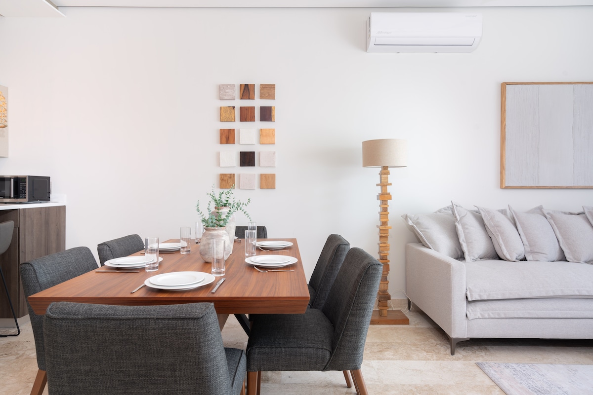 Luxury apartment in Aldea Zama. 7 min drive to beach, 5 min drive to Tulum Centro, walking distance to restaurants and shops in Aldea Zama. Local and high end furniture throughout creates a clean and artistic environment. Private pool and underground parking. Two free bikes. Your own theatre lowers from the ceiling with the click of a button. Fully outfitted kitchen, TVs, Games. You won't even need to leave.