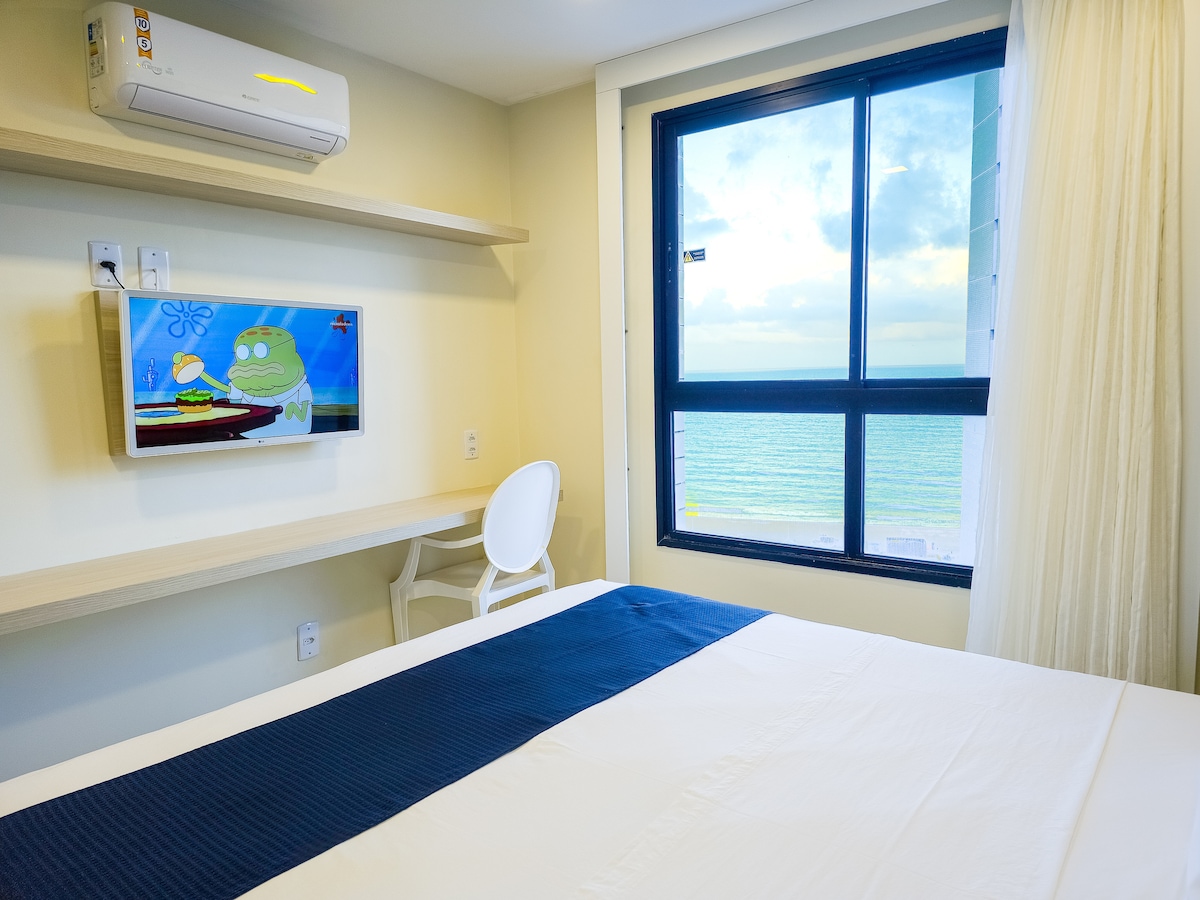 Na melhor localização de Natal. Localizado na Av. Engenheiro Roberto freire, andar alto e vista para o mar. No coração do turismo de Natal. Próximo a praia, shoppings, farmácias e supermercados. O prédio conta com estacionamento, piscina, restaurante, academia e auditório para eventos. O quarto fica em andar alto com cama de casal, geladeira e microondas, ar condicionado, tv e chuveiro quente.