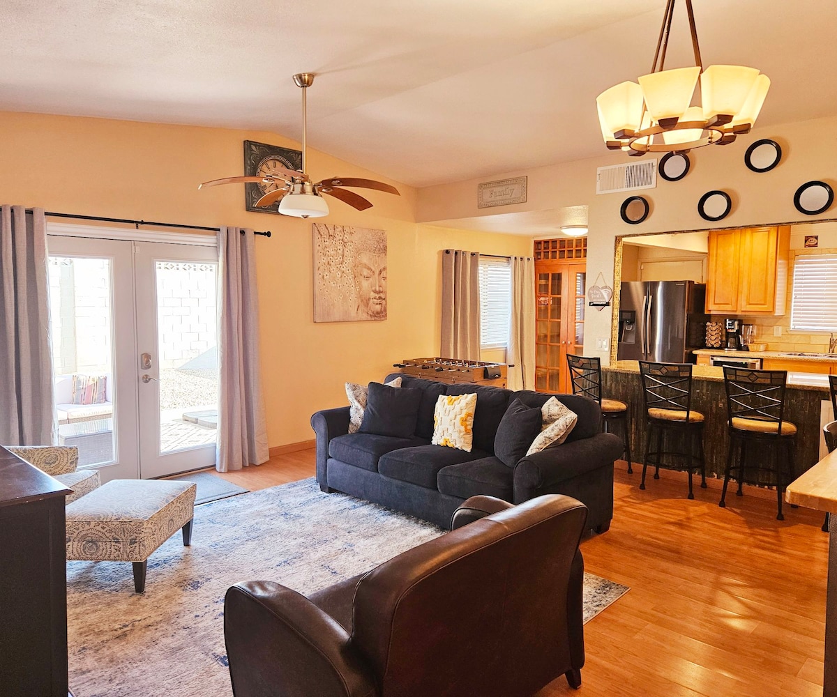 Guests Favorite, Located in the heart of Las Vegas, Professionally designed Elevated Single Story 3-bedrooms and 2-bathroom vacation home. 🌟 Exceptional Amenities Await: Sparkling 🏊♂️ swimming pool back yard with games. 🏓 Game time: Ping pong, Shuffle board, Foosball and more... Beautiful living room by the pool, with a 75" Smart TV! 🛌 Hotel grade mattress Bedrooms each with a Smart TV. Fully Equipped Kitchen 🛁 Bathtub & 🚿 Shower on property