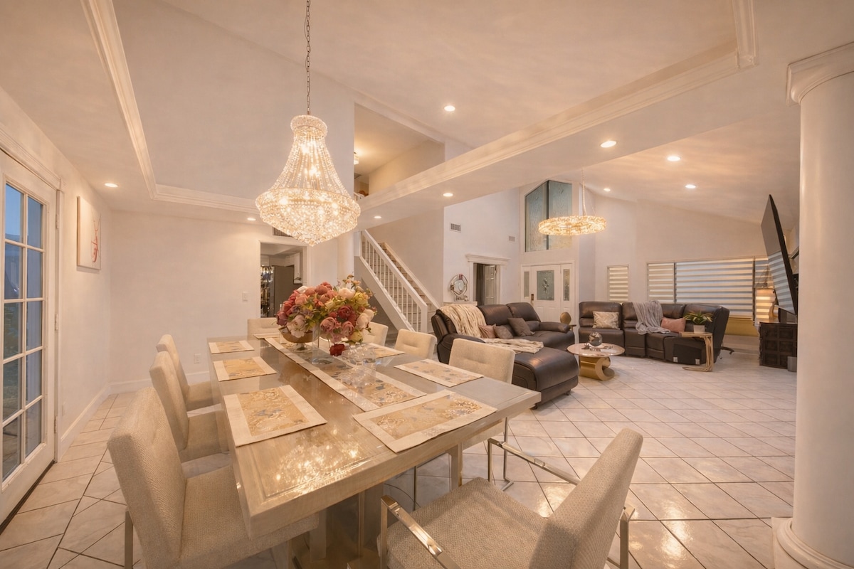 🌸 Prime Location: Just 15-20 mins from The Strip and 10-15 mins from Downtown Las Vegas. 🏖 Inspired Design: Experience the charm of the original Mirage Hotel, adorned with memorabilia and Las Vegas history. 🐬 Relaxation & Luxury: Enjoy a palm-shaded lagoon, elegant home, and poolside lounging next to golden dolphins. 🧘♀️ Quiet & Safe Neighborhood: Nestled in the heart of Las Vegas, close to all major attractions. Pool heating is available and comes with a fee.