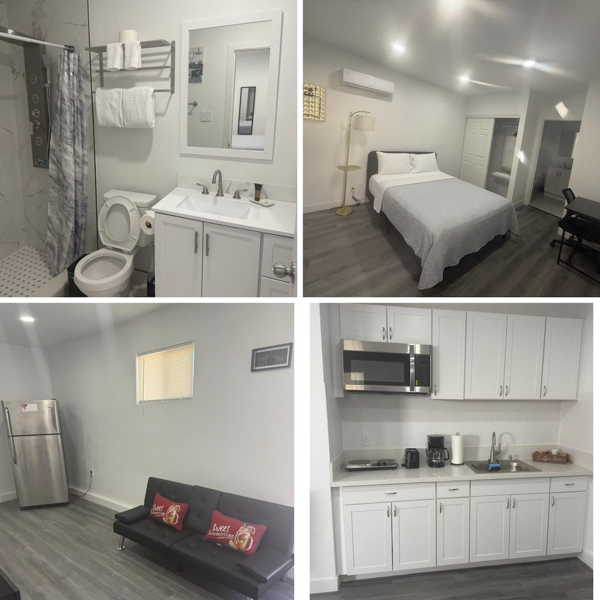 luxurious studio with private entrance, all decorated in black and white colors, has a kitchen with all kitchen accessories, queen bed, folding bed for another additional person, tv , air and heating are individual for the rest of the house since the studio has a mini split installed, it has a smoking area outside