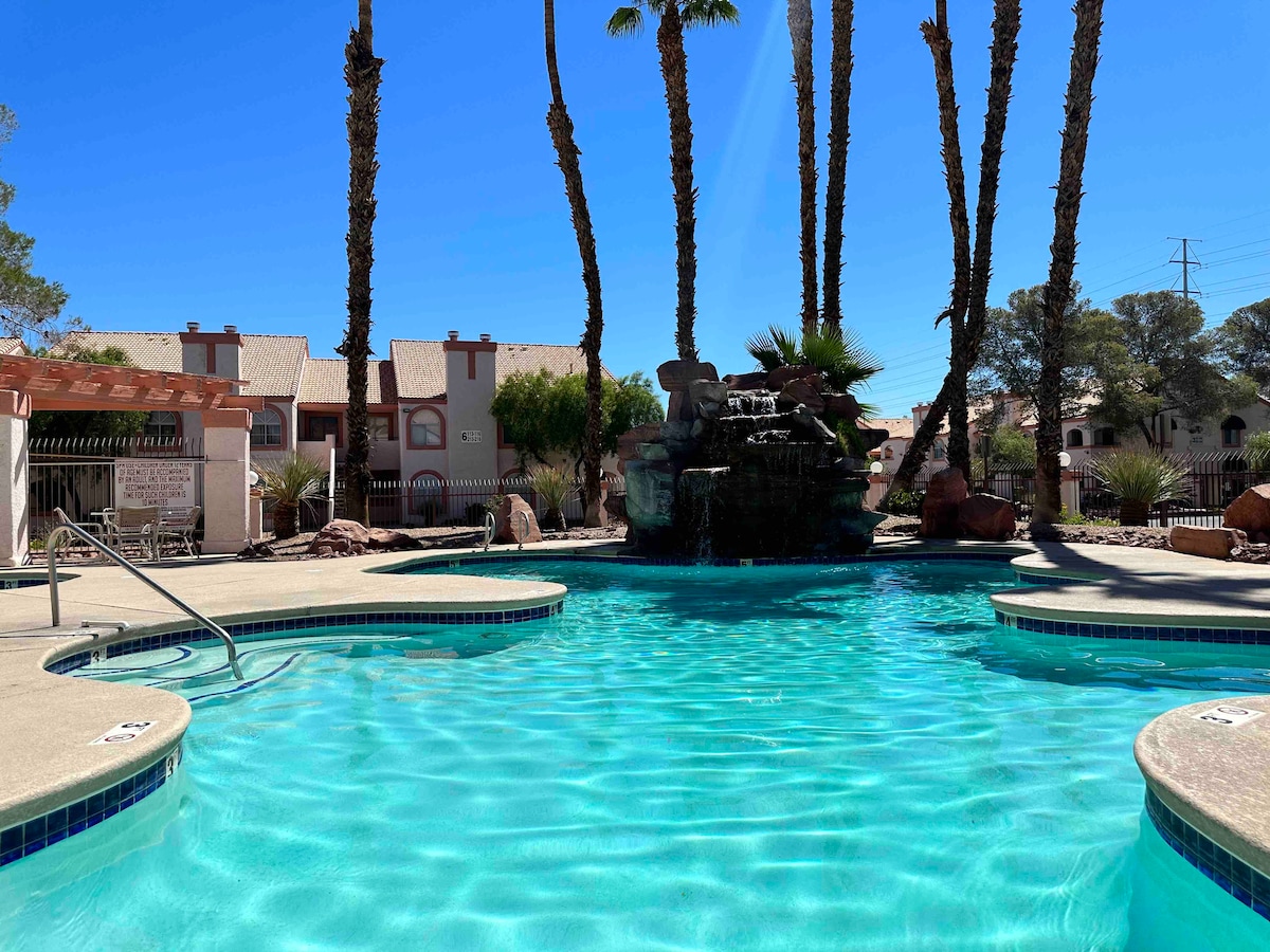 Amazing Condo 5 miles from the Bellagio Hotel located in the heart of Las Vegas Strip the unit includes brand new furniture, a Fully equipped kitchen, 40" flat panel TV, King bd and queen sofa bed, a Private Balcony overlooking the Tropical Pool (is closed few month out of the year). Pool views from the room also. Shopping, market, park, bus stop, everything is nearby. We will wait for you!