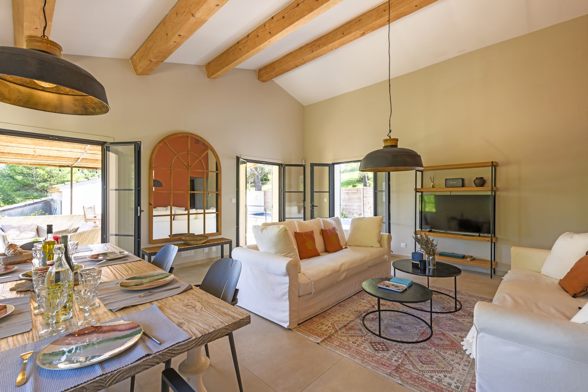 Charming 120m² village house, fully air-conditioned and completely renovated, ideally located in the quiet center of Maussane-les-Alpilles. You'll find a spacious living area with a large lounge and a fully equipped open-plan kitchen. There’s also a dedicated office corner and a utility room with toilet and laundry facilities. The sleeping area includes three bedrooms with brand-new bedding: one master suite with its own private bathroom, and two additional bedrooms sharing a full bathroom.