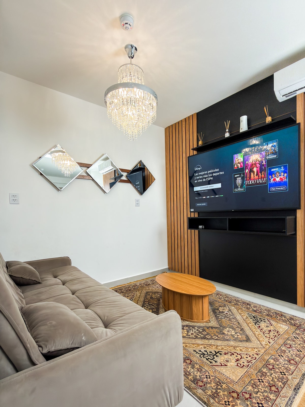 Apartamento con balcón vistas al río y excelente ubicación!📍. A pocos pasos de la Costanera, Playa San José🏖️, restaurantes🍴 y de Shopping Costanera 🛍️. Habitación principal con cama matrimonial 🛏️, sala con sofá cama(2.10 x 0.95 x 0.92) 🛋️, comedor, cocina integrada y baño moderno 🚿 Seguridad 24/7 🔒 y servicio de lavandería dentro del edificio para tu comodidad. Aires Splits en habitación y sala-comedor.