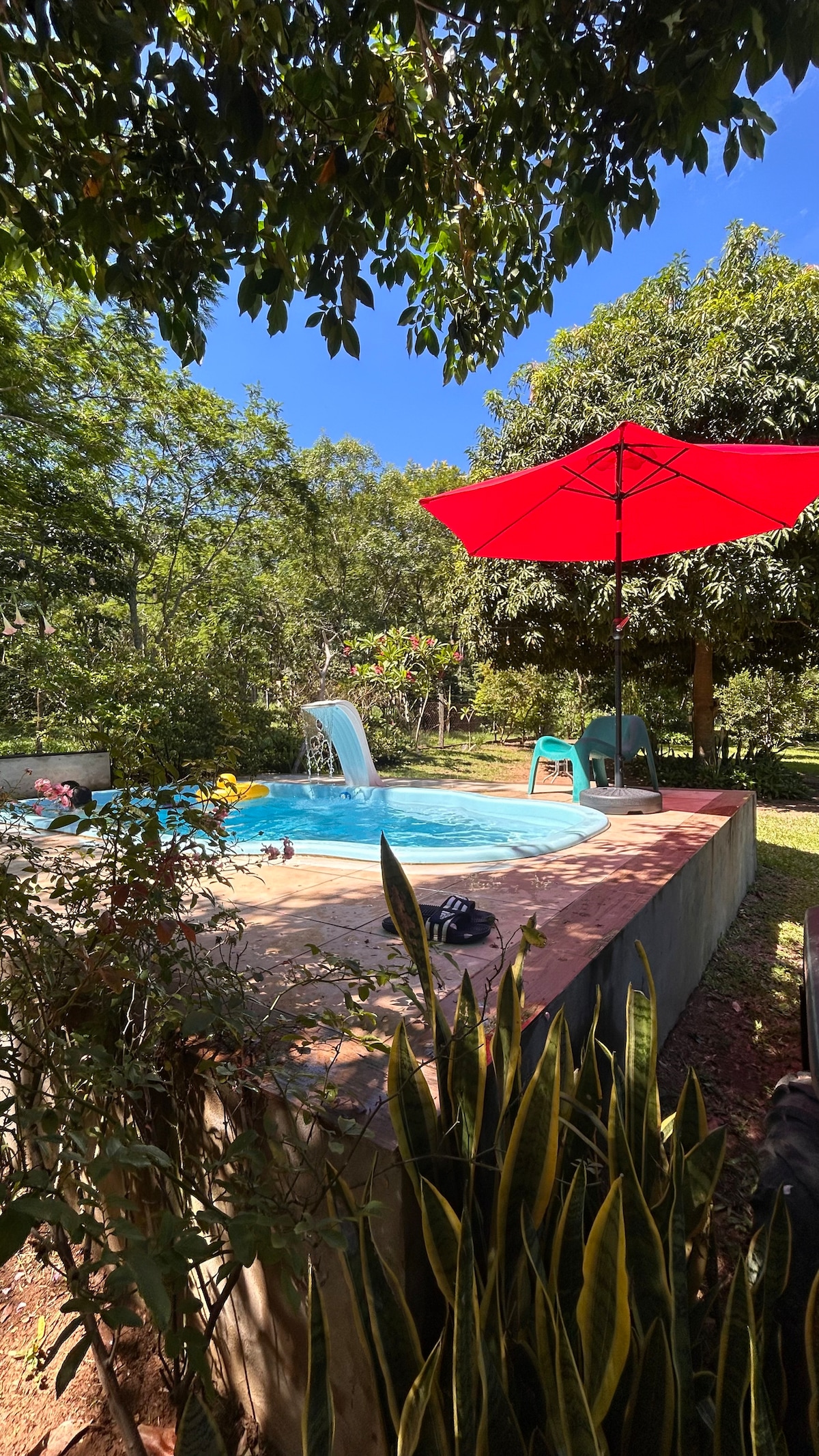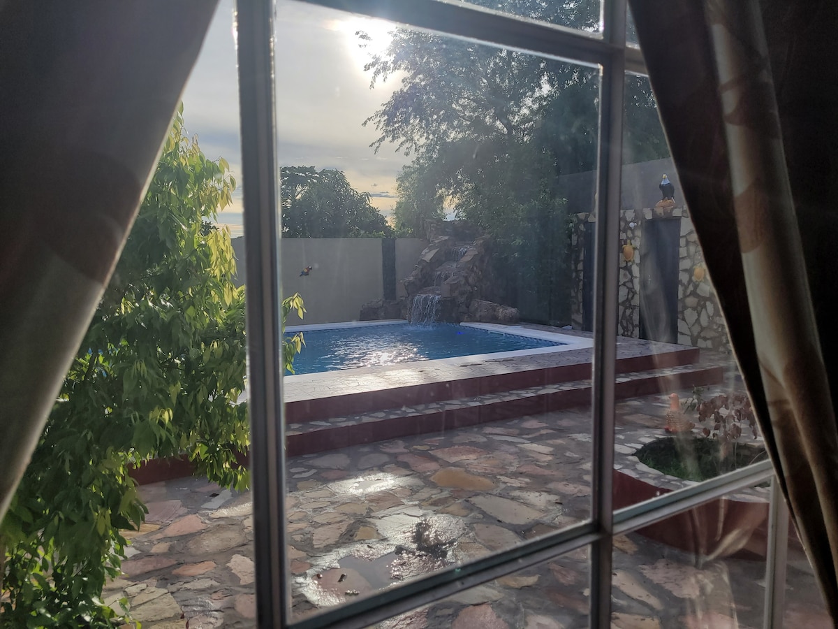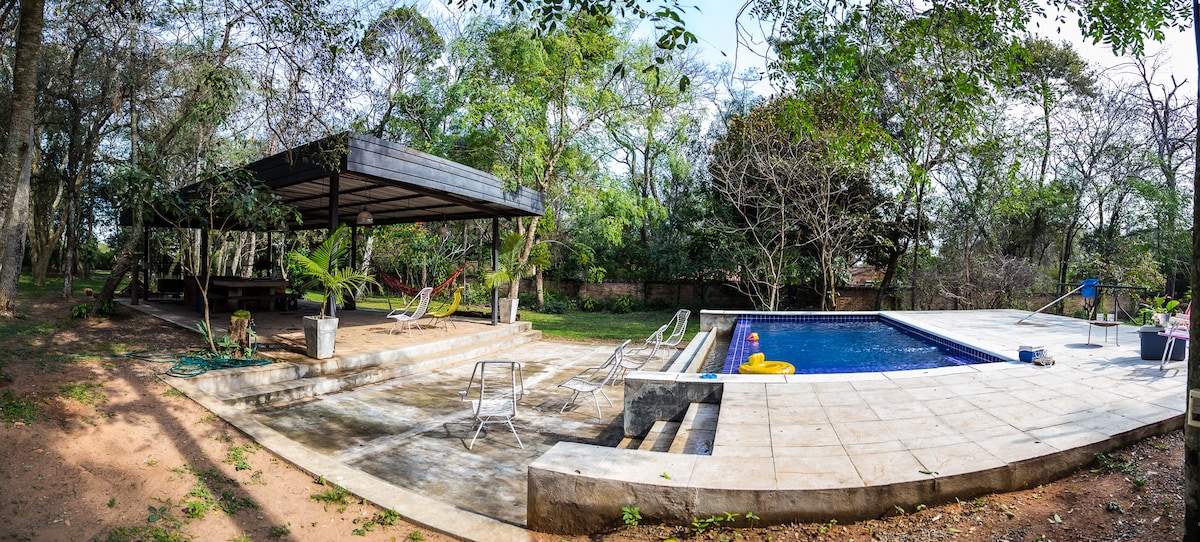 Enjoy the swimming pool with waterfall, relax in the whirlpool... Prepare meats/fish/pizza/typical meals in the barbecue and tatakuá oven and enjoy at the wooden table/under the trees. Air conditioning in the bedroom and in the kitchen/living room 2. The 1000 litre tank ensures the water supply. Help with excursions. Lake Ypacaraí is just a few km away.