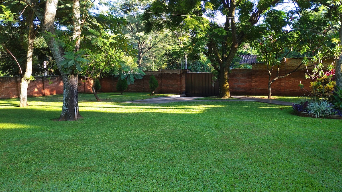 Cómoda casa construida en medio de un pequeño bosque preservado. El espacio ofrecido en este anuncio forma parte de una gran construcción dividida en dos sectores: 1 La casa en la que vivo 2 espacio de invitados separado. compartidos conmigo: el área al aire libre y la piscina. Ubicado en la ciudad de Areguá, a orillas del lago Ypakarai, que es conocida por sus artesanos de arcilla y plantaciones de frutillas que atraen visitantes durante todo el año. La casa dispone de sistema de alarma y wifi.
