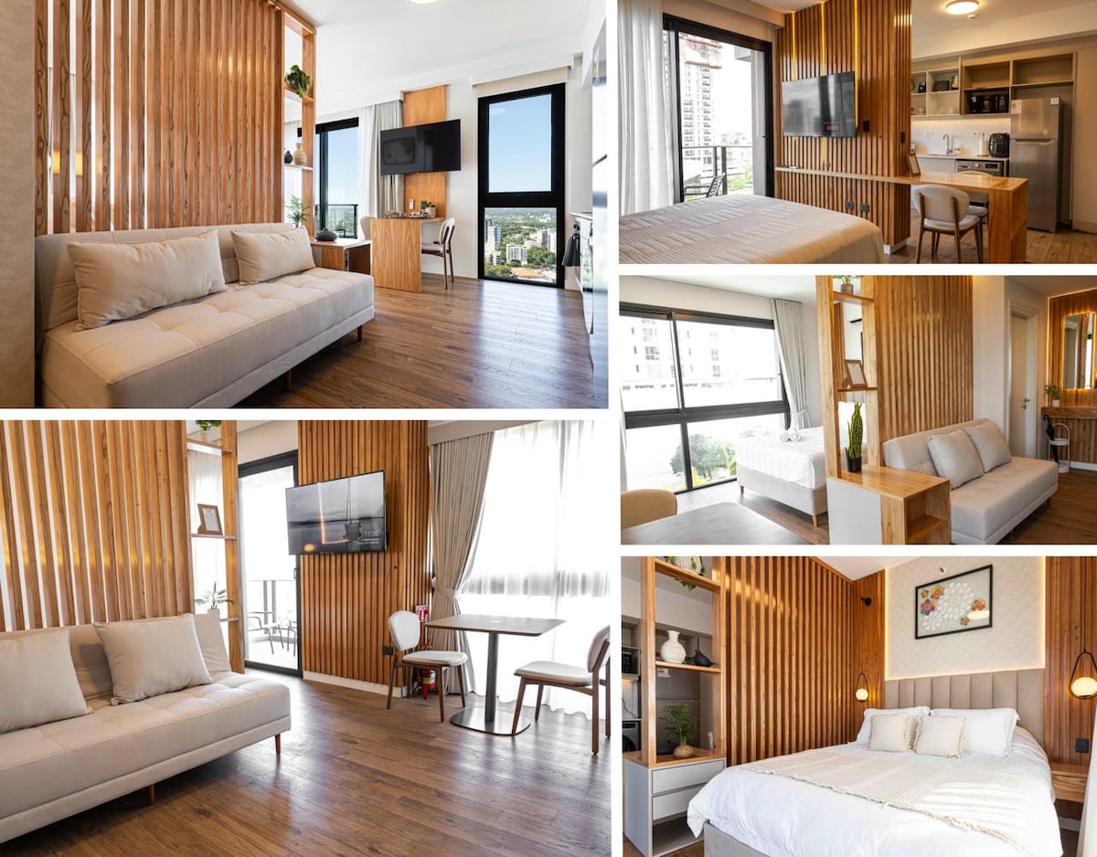 This unit is located in Asunción’s corporate center, just a few steps from the two largest shopping malls, giving you access to the best restaurants and stores without the need for a vehicle. From its rooftop, you can enjoy stunning views of the city, featuring a variety of vegetation and different tree species, as well as the Asunción Bay, which belongs to the Paraguay River.
