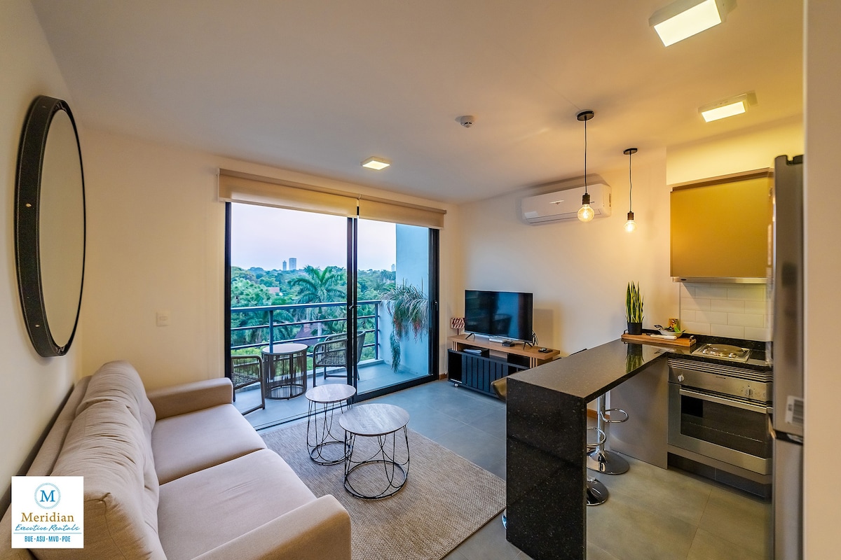 This unit is located in Asunción’s corporate center, just a few steps from the two largest shopping malls and World Trade Center, giving you access to the best restaurants and stores without the need for a vehicle. From its rooftop, you can enjoy stunning views of the city, featuring a variety of vegetation and different tree species, as well as the Asunción Bay, which belongs to the Paraguay River.