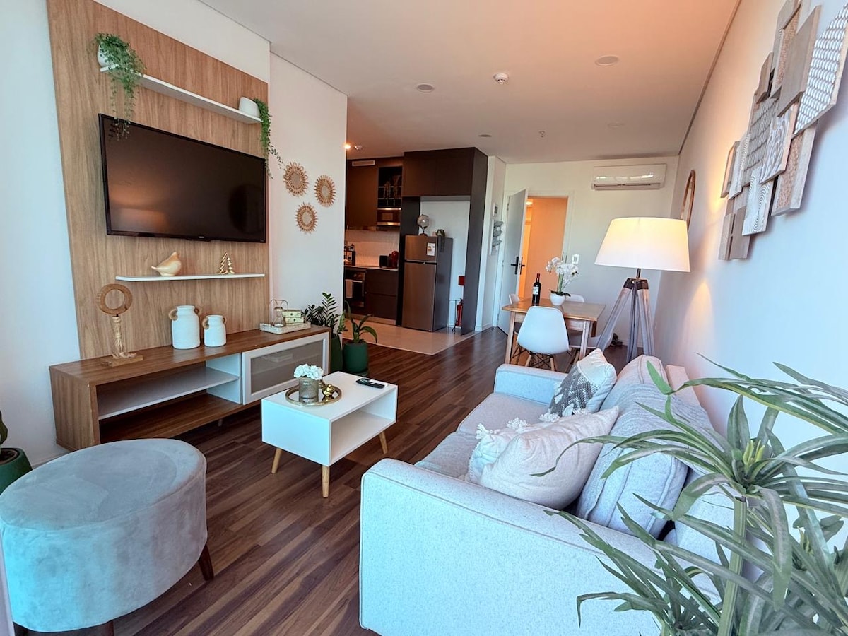 Exclusivo departamento en el último, 16vo piso con terraza privada. Excelente ubicación en la zona vip residencial de Asunción. Terraza privada con parrilla, comedor exterior para 8 personas y área de estar. Vista panorámica de la ciudad y atardecer en la Bahía. Cuenta con un dormitorio matrimonial súper king en suite con TV Smart y servicio de TV Cable. Otra habitación doble en suite, y una habitación pequeña con sofá cama, que cuenta solo con ventilador y baño enfrente.