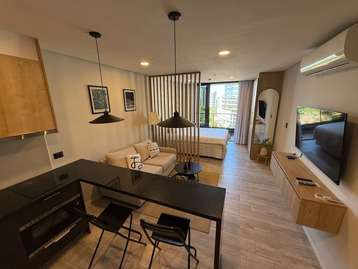 Departamento nuevo a estrenar en edificio lujoso. Tiene 40m² propios, con Smart TV, WIFI, y en el edificio tenes todos los amenities: Piscina , Quincho climatizado con parrilla, Sala de juego de niños, gimnasio equipado, etc Queda a 5 minutos en auto del centro corporativo mas valorado de la capital, y a 25 minutos caminando. Tambien queda a 11 minutos en auto al aeropuerto Silvio Pettirossi Tiene una cama matrimonial + un sofa cama. En total se pueden hasta 3 personas para dormir.