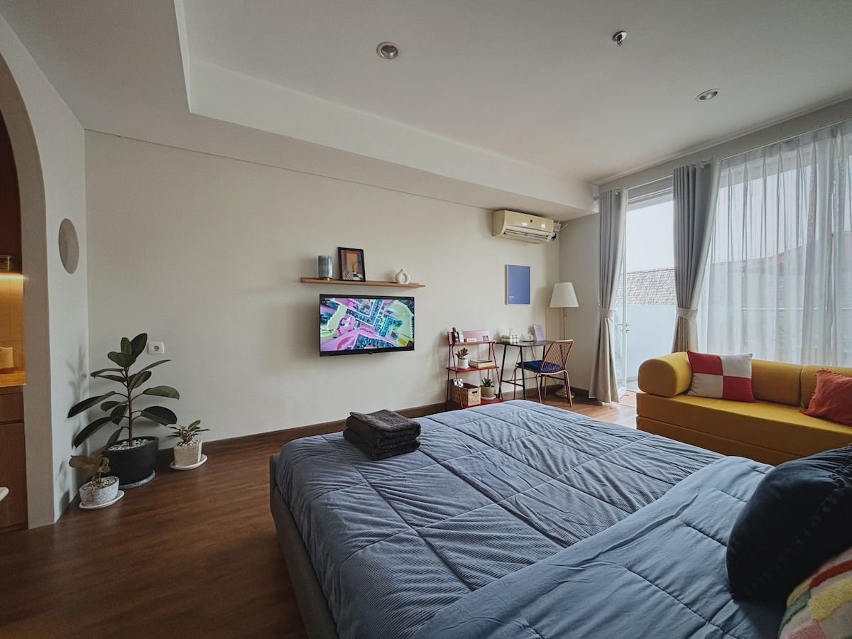 Welcome to Chroma Studio Apartment by Moin BnB! Located in strategic area only 5 mins walk to the famous Dago street, 10 mins walk to Sabuga jogging track and Bandung zoo, ca. 35 mins to floating market Lembang by car. We accommodate up to 4 guests. We have a queen size bed 200x160 cm & sofa bed 180x160cm, a bathroom with shower, towels & water heater, kitchen set, and smart TV. Please read our terms and conditions before making a reservation.