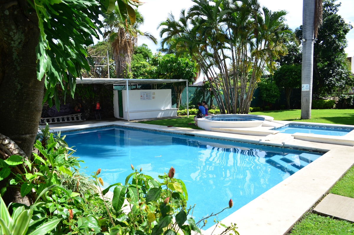 Descansa en este pacífico y cómodo alojamiento. Durante gran parte del año disfruta del relajante sonido del agua de la cañada que rodea la propiedad. Gracias a este entorno natural, contamos con exuberantes áreas verdes en un gran ambiente familiar. Dispone de 2 albercas ( de martes a domingo), seguridad las 24 horas, y estacionamiento privado. Ubicado a 8 minutos del centro de Cuernavaca, a 12 minutos de centros comerciales y 5 minutos de la salida a la autopista México - Cuernavaca.