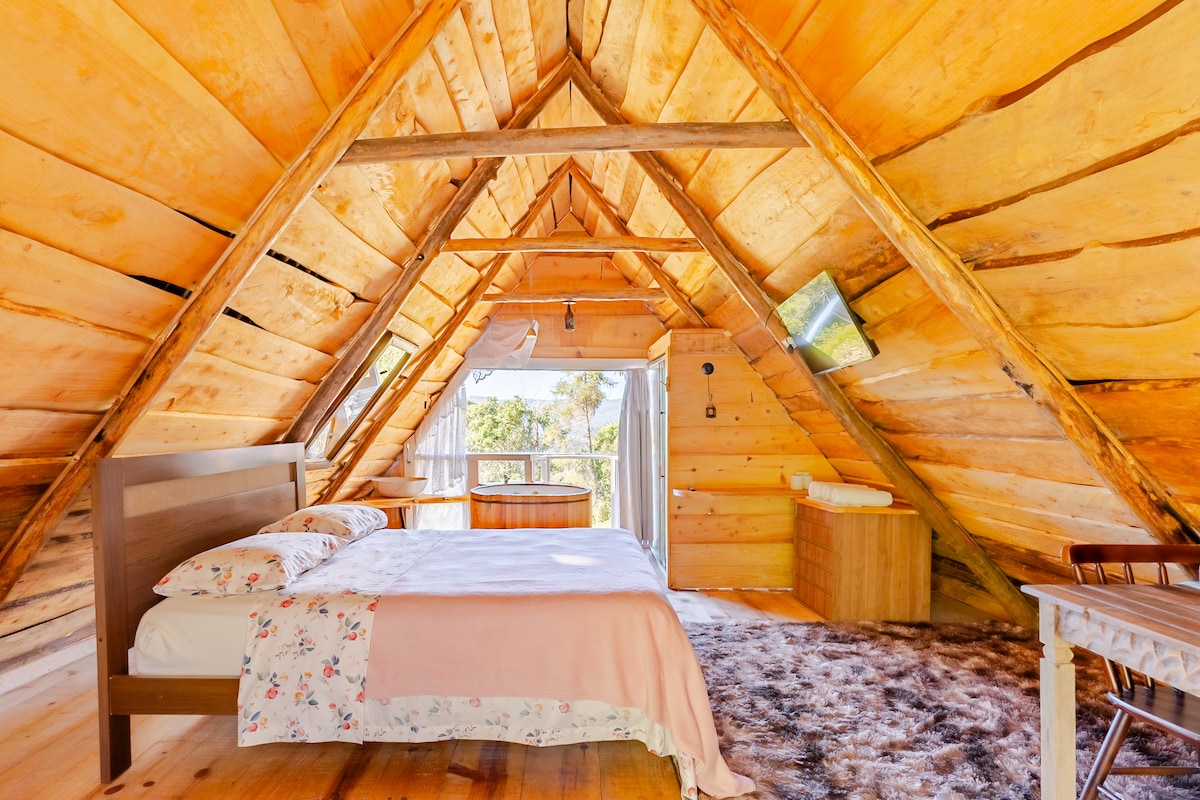 Chale Naturae accommodates 1 couple (or 2 people) who want to enjoy the mountain. Easy access to waterfalls, trails, downtown, restaurants and Campos do Jordão. We are on private land, fenced and with an active orchard. The chalet is rustic, super cozy and has a breathtaking view! It has a box bed on the mezzanine, a sofa in the living room, fireplace, excellent quality wifi, equipped kitchen and bathroom with a view of nature. Also fire pit area. Self check-in.