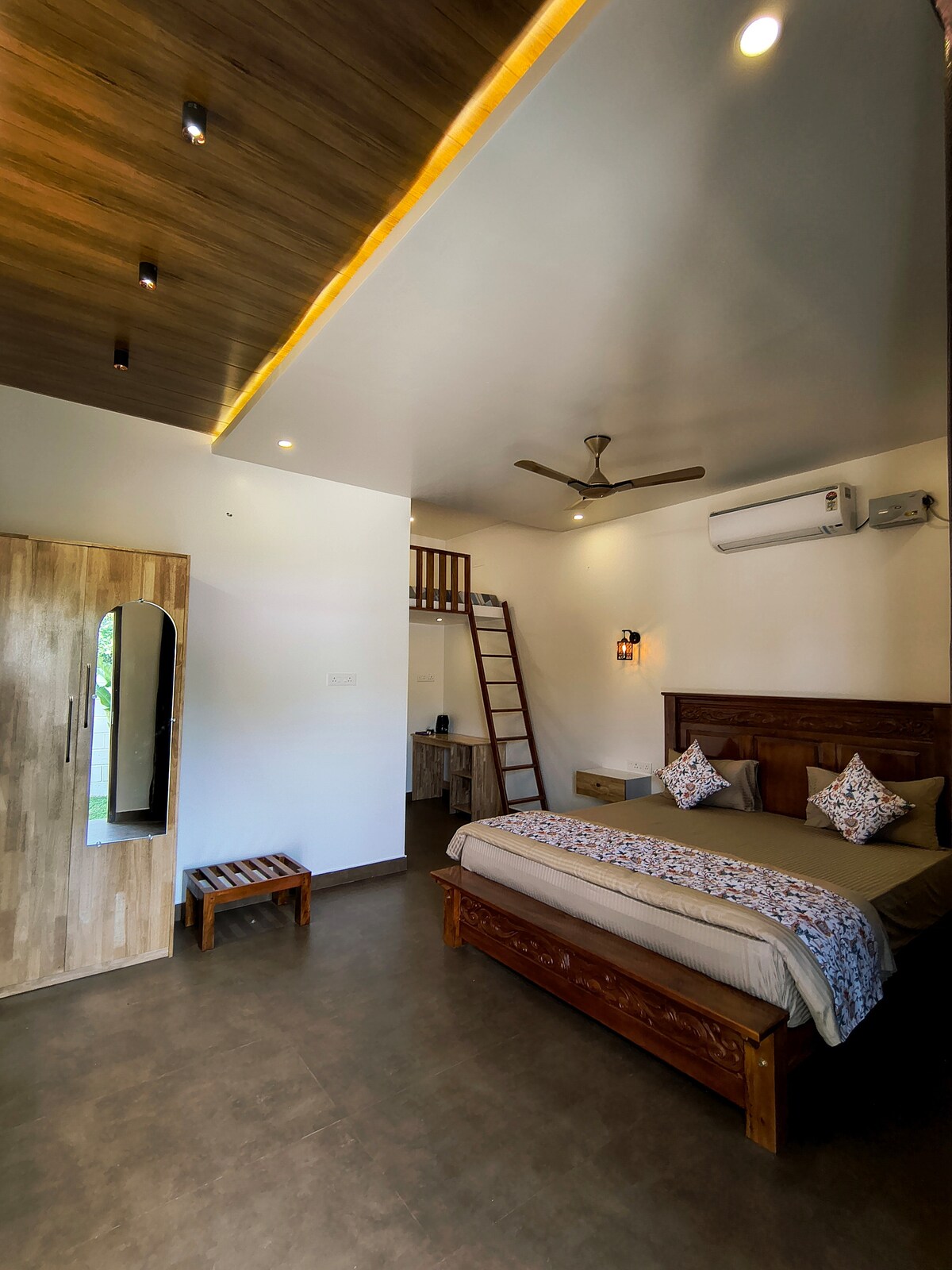 1 BH Riverfront Villa, fully air-conditioned with 2 ACs , on Kanyakumari Bypass Road in Suchindram is on the banks of Pazhayar River. Suchindram Temple is 1 km away, Kanyakumari and Roundfort are 10 kms, 15 mins drive from our villa. Ours is a single AC bedroom villa with attached rest room. It has an AC hall and dining room. Sit out, Kids Play area, Patio near the river and a Swimming Pool with cascade provide quality recreation, peaceful family time and value for your money.